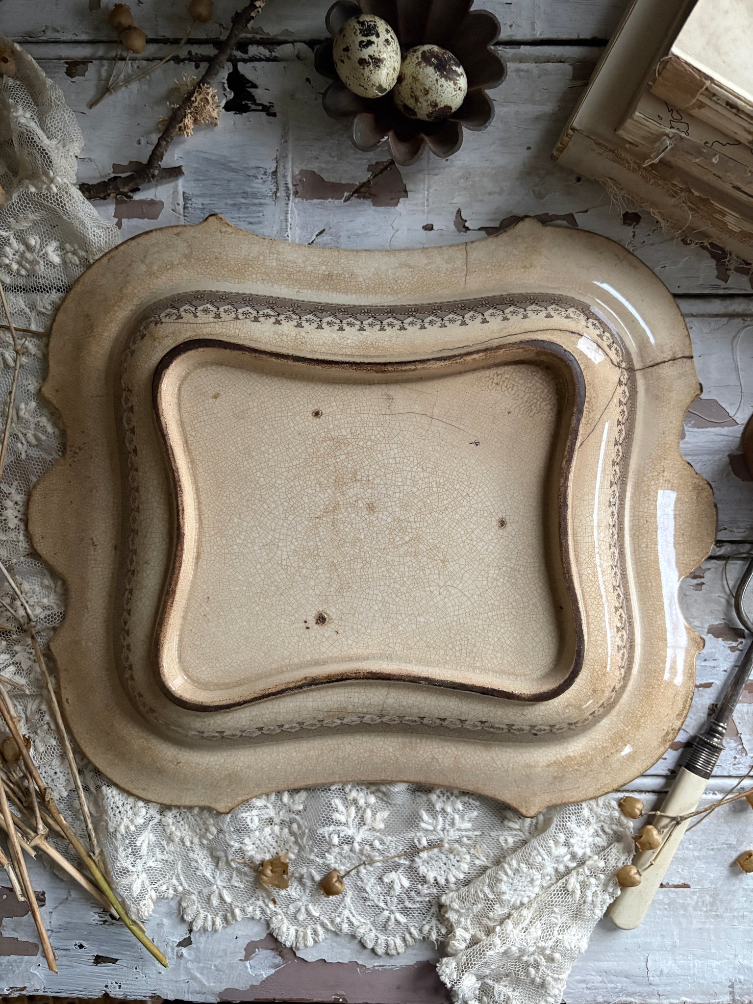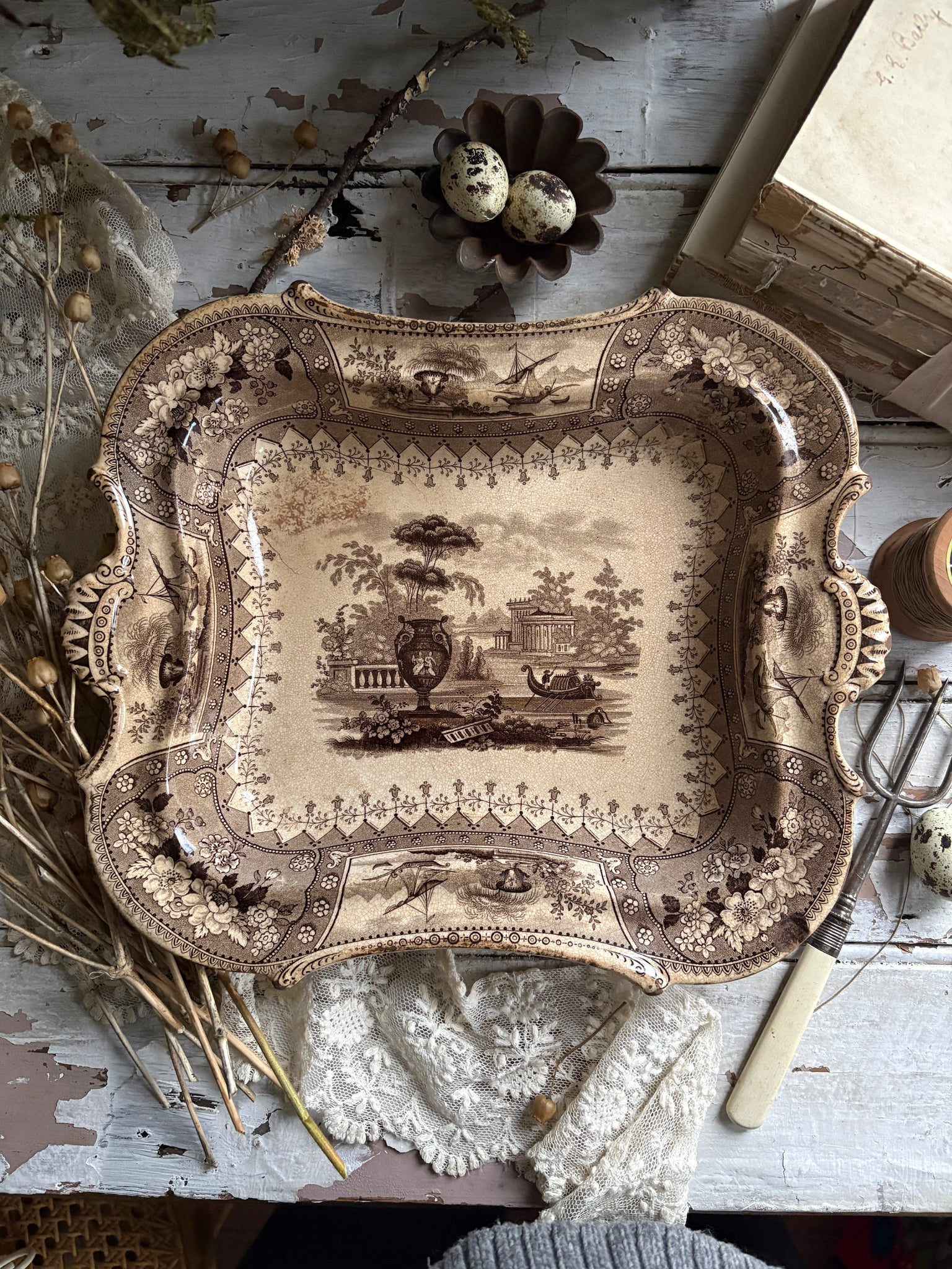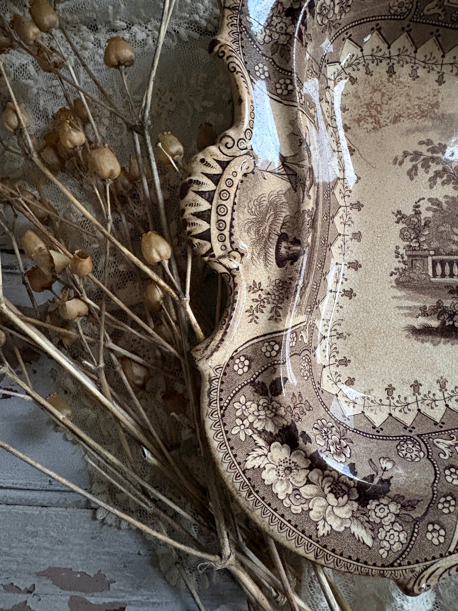 This beautiful antique brown transfer ware serving dish is a true treasure for lovers of timeworn ceramics and rustic interiors. Decorated with an ornate floral border and an atmospheric classical landscape, it brings a sense of old-world romance to any room. Its softly aged glaze, crazing and patina give it that unmistakable charm only genuine 19th-century pottery holds.