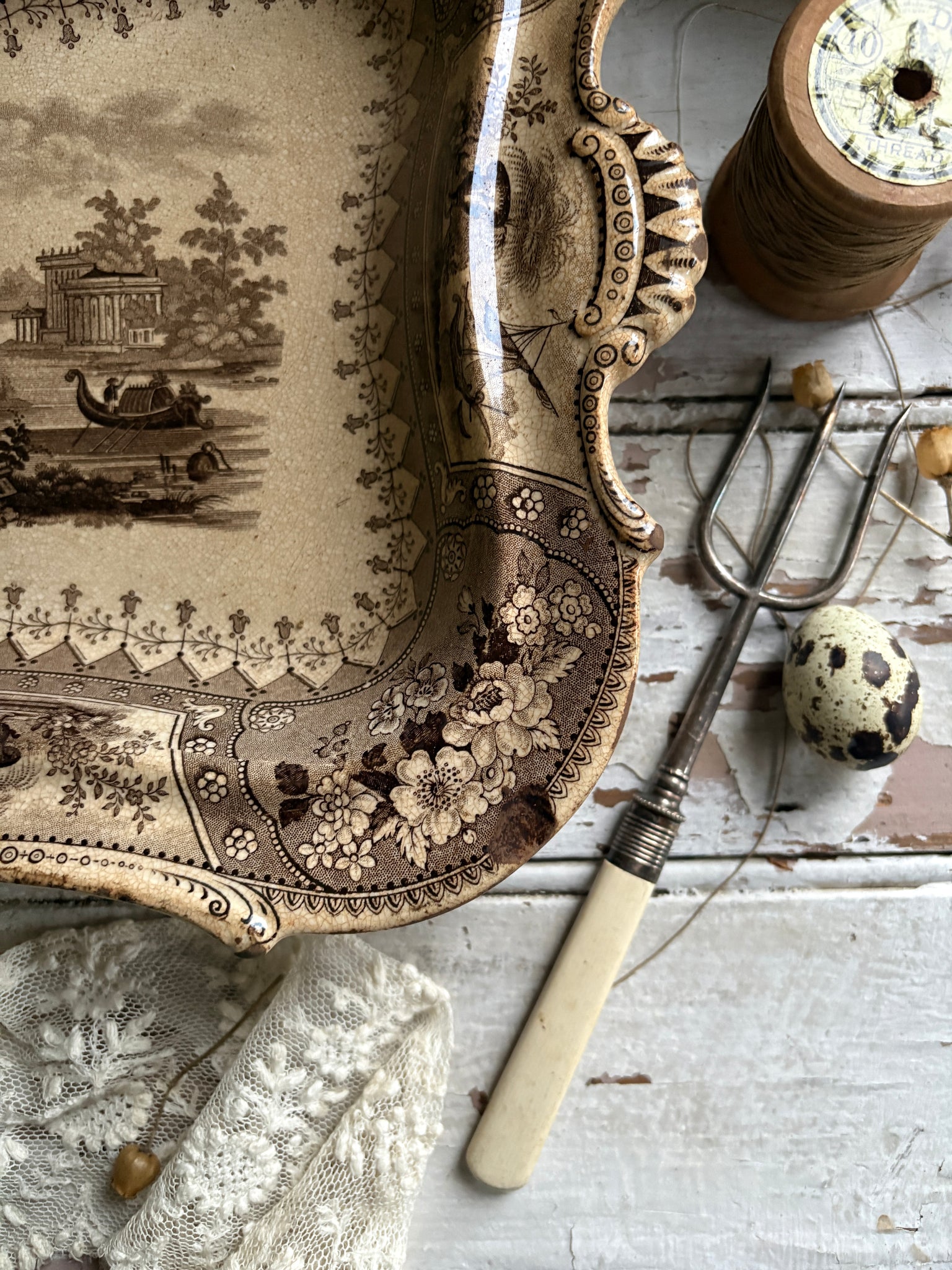 Produced during the Victorian era, transfer ware like this was adored for its intricate scenes inspired by travel, architecture and the romantic imagination. Pieces were often displayed on dressers, sideboards or used on special occasions. This dish has survived with a beautifully mellowed, creamy glaze and the sort of character that only decades of life can create.