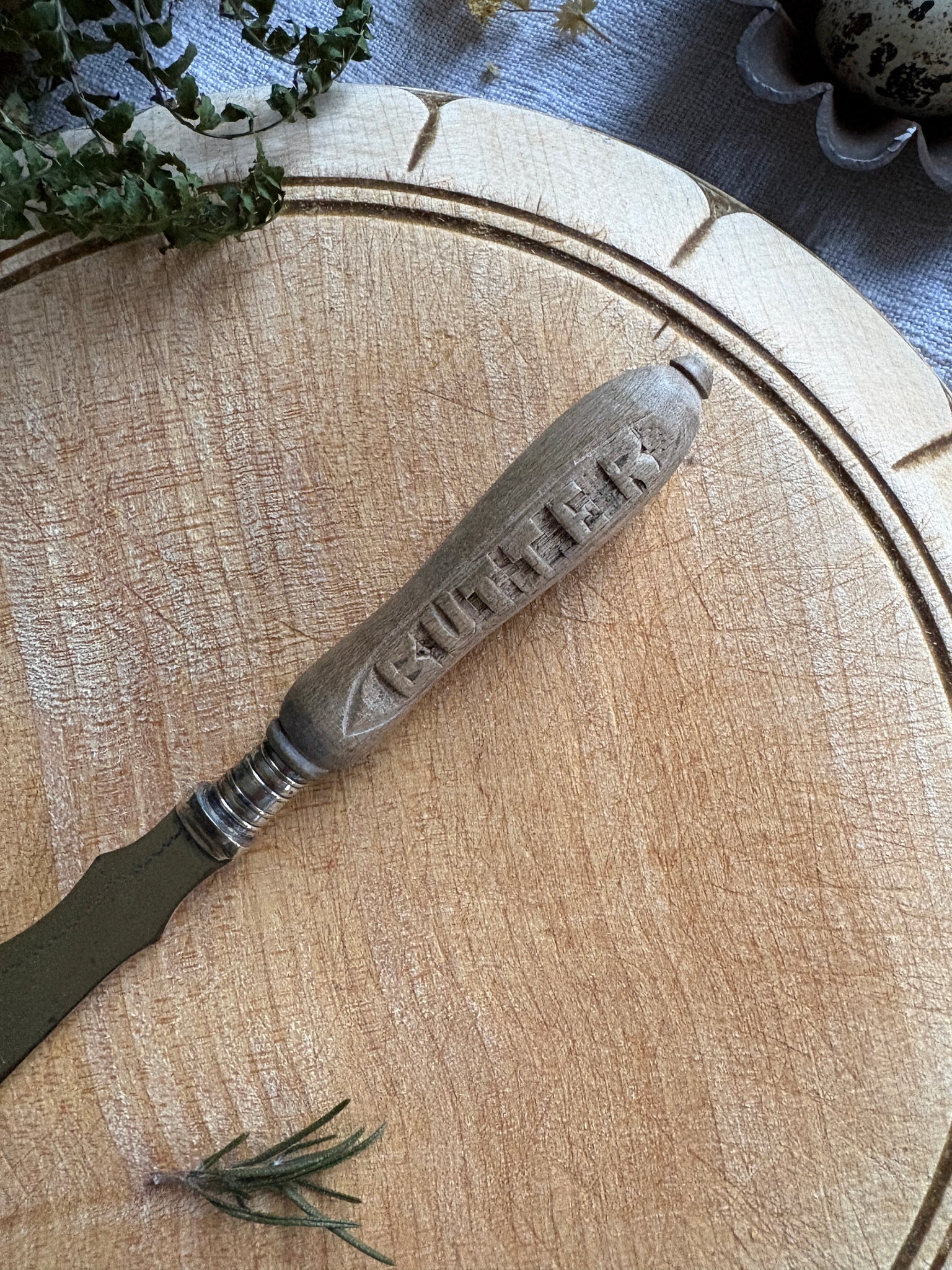 Add a touch of rustic charm and timeless elegance to your table with this antique butter knife, a delightful piece of culinary history. Crafted with care and rich in character, this vintage treasure features a wooden handle intricately carved with the word “BUTTER,” making it both a functional utensil and a conversation piece.