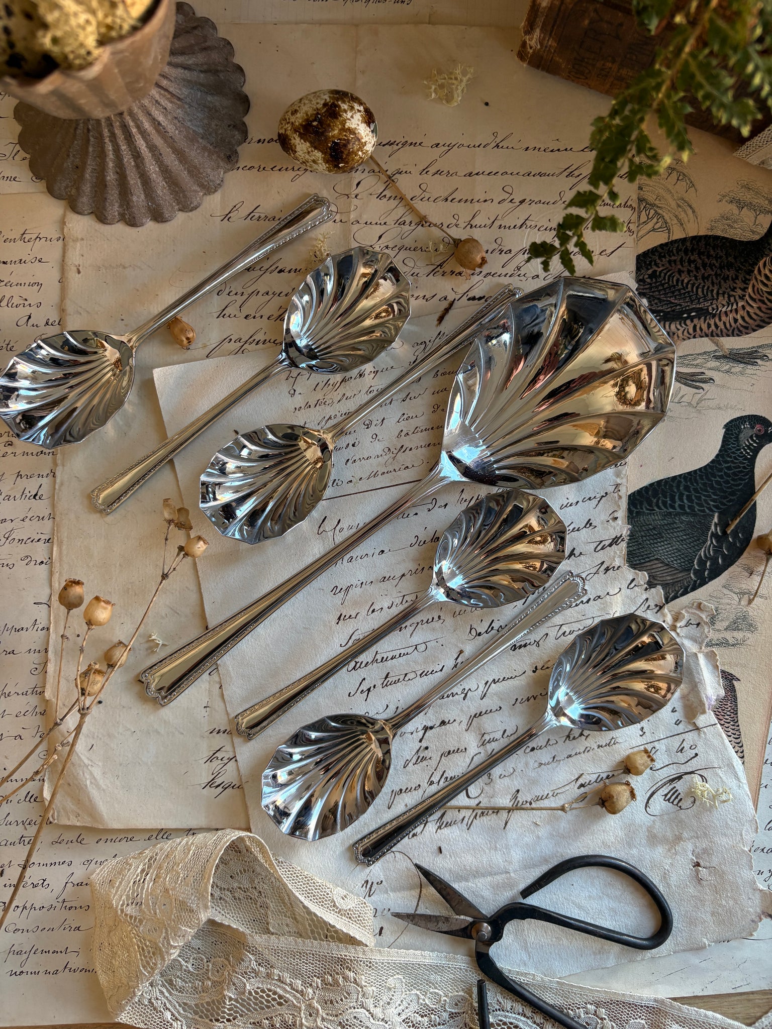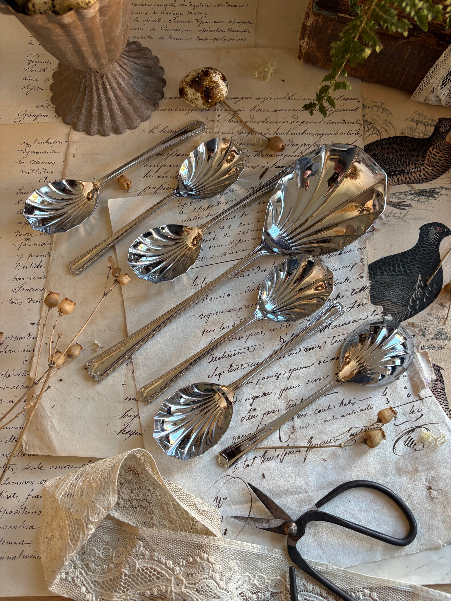 Each spoon is delicately shaped with a scalloped shell bowl, catching the light in that unmistakable vintage way. The design feels refined yet charming, perfect for serving sugar, jams, condiments, or simply dressing a styled table.