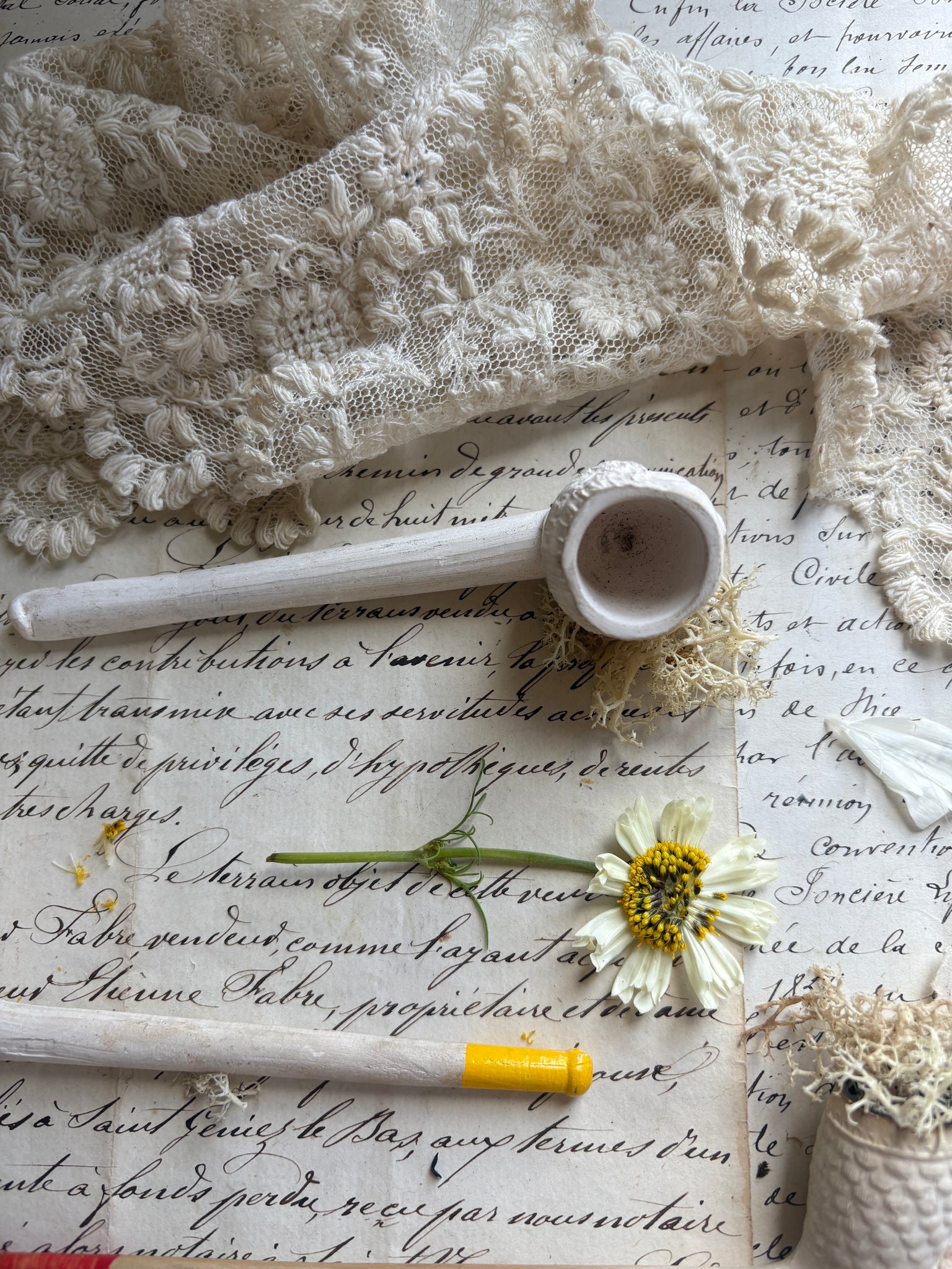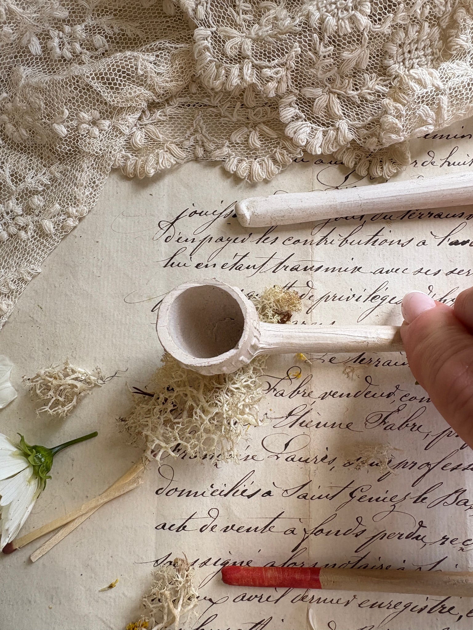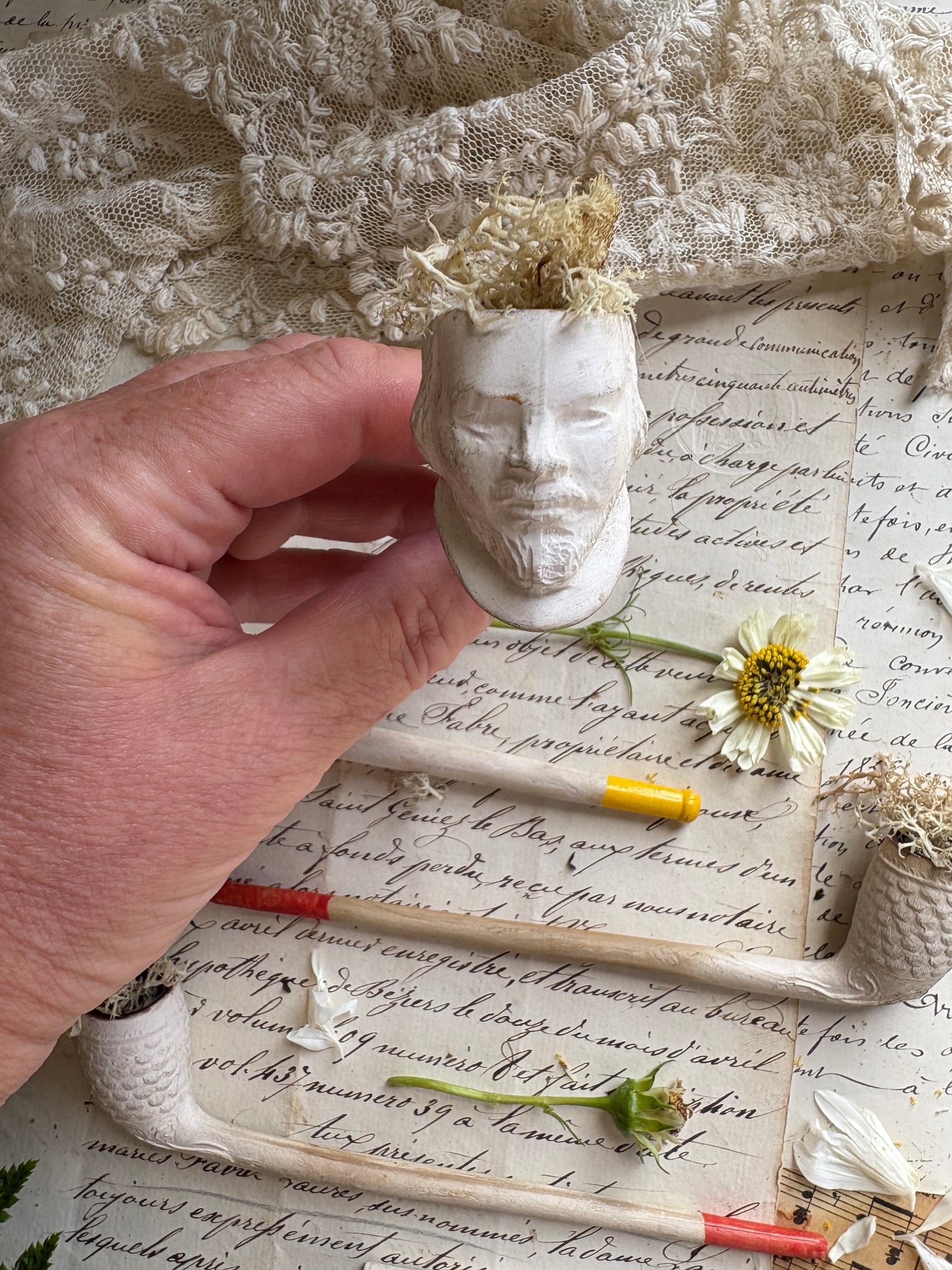 Each pipe has its own character — from a finely detailed bust of a gentleman, to textured basket-weave bowls and elegantly fluted designs. Their chalky white clay is mellowed with age, some bowls still have used tobacco , adding to their storybook charm.