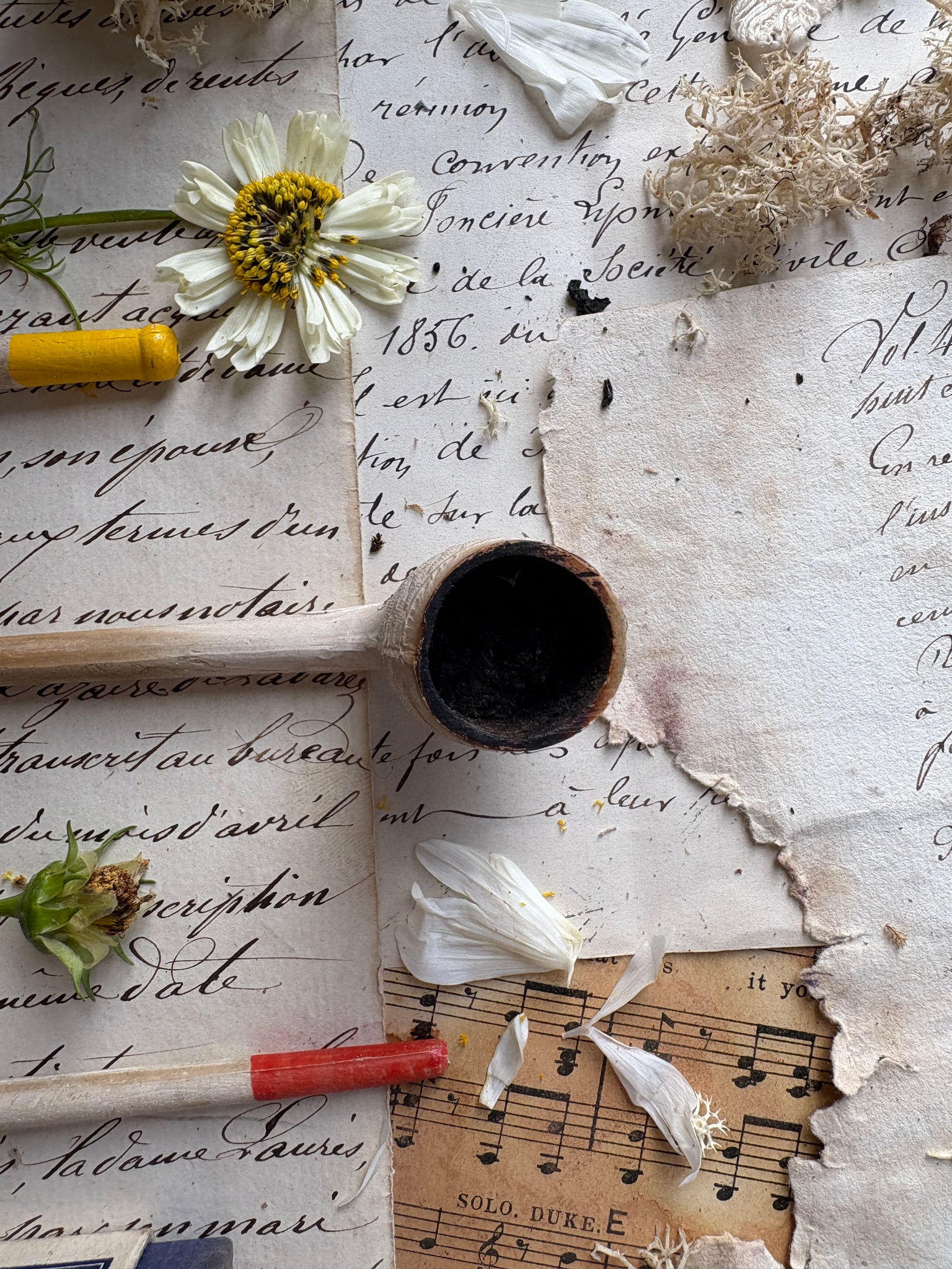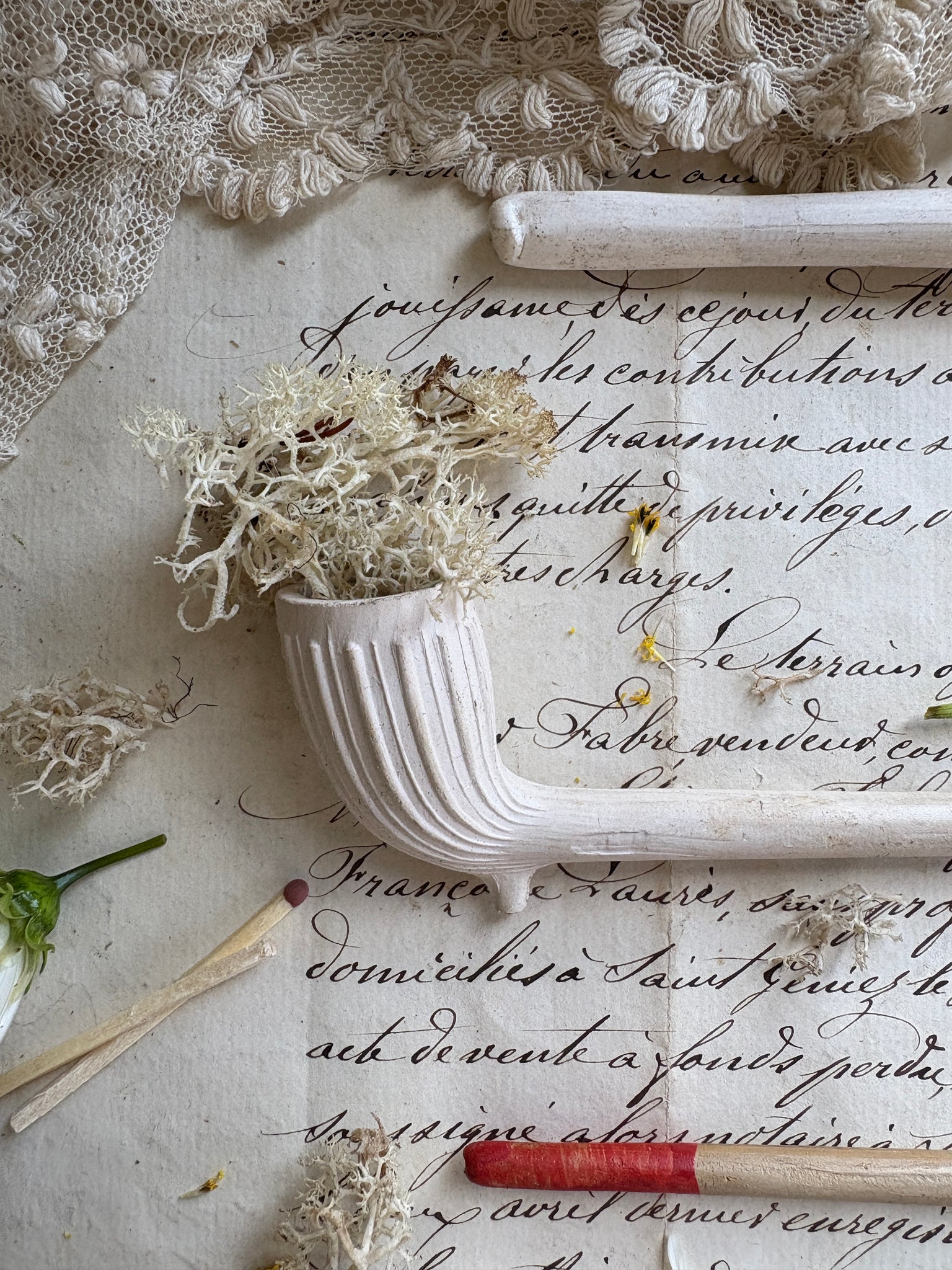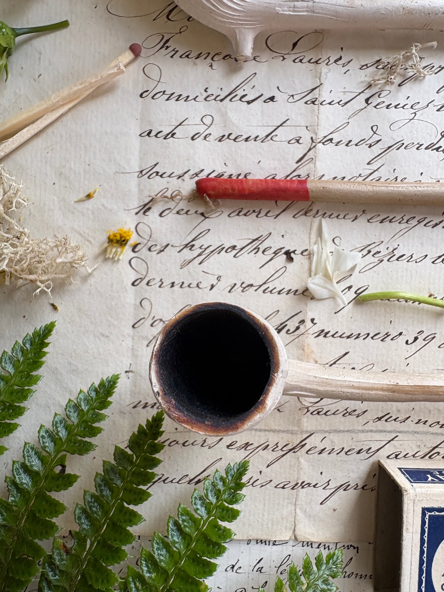 Each pipe has its own character — from a finely detailed bust of a gentleman, to textured basket-weave bowls and elegantly fluted designs. Their chalky white clay is mellowed with age, some bowls still have used tobacco , adding to their storybook charm.