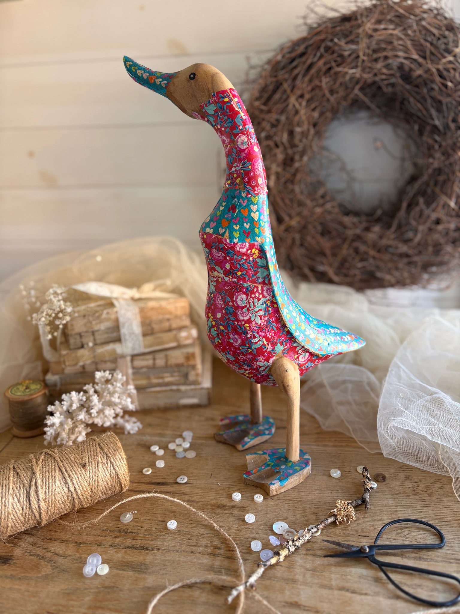 Carved by hand from sustainably sourced bamboo root, the duck showcases the natural character of the material, with subtle variations that make every piece unique. Part of the body is finished with a decorative decoupage covering, featuring a vibrant floral pattern of bold pink flowers accented by a turquoise heart motif, adding a playful and uplifting touch.