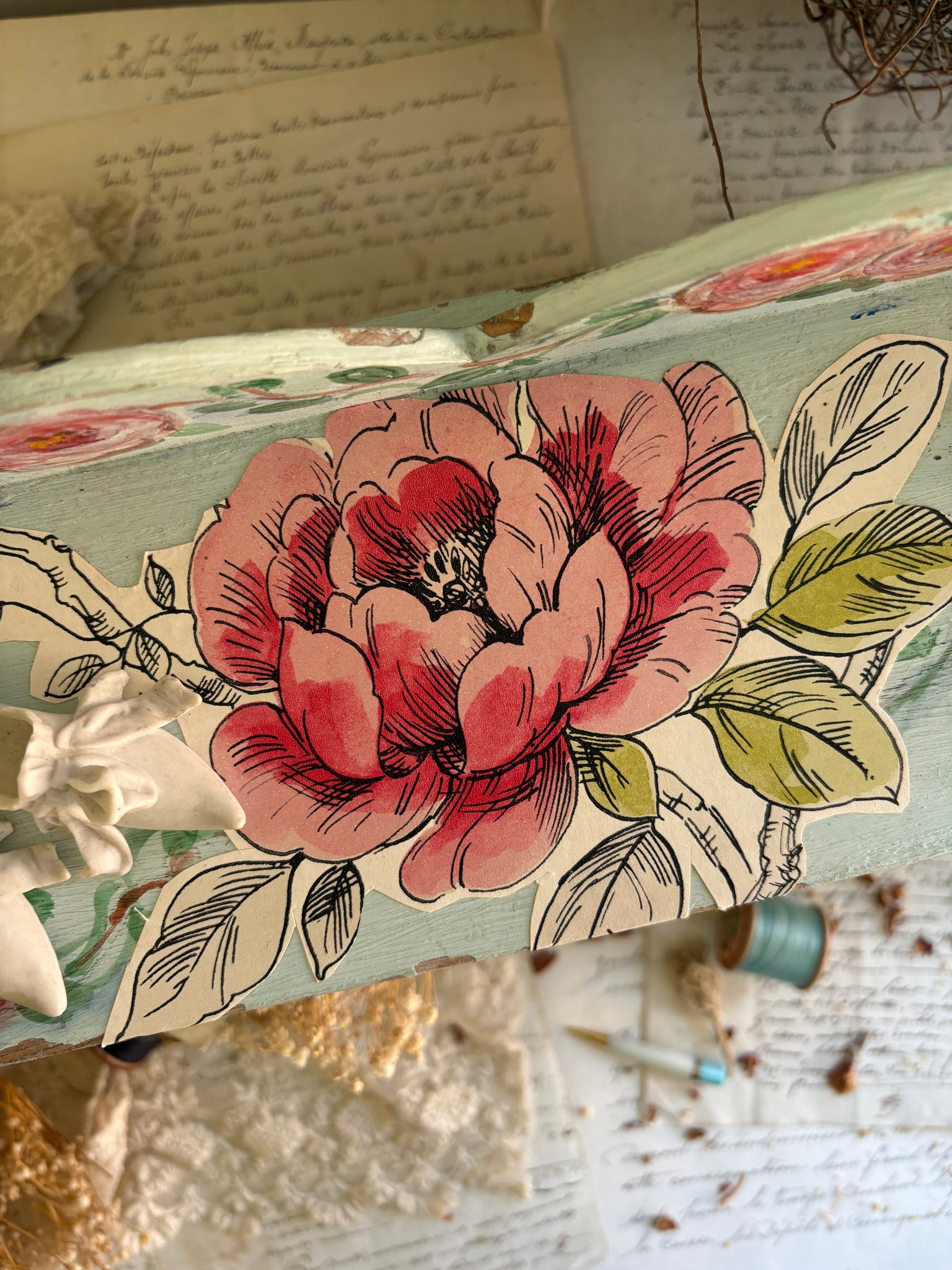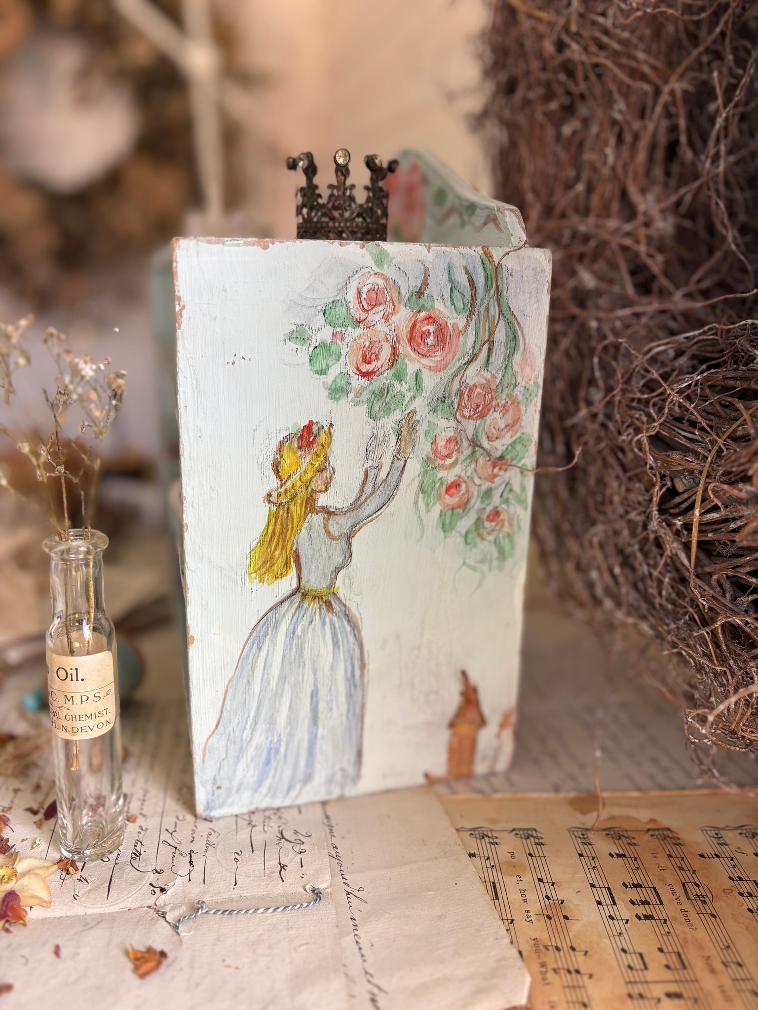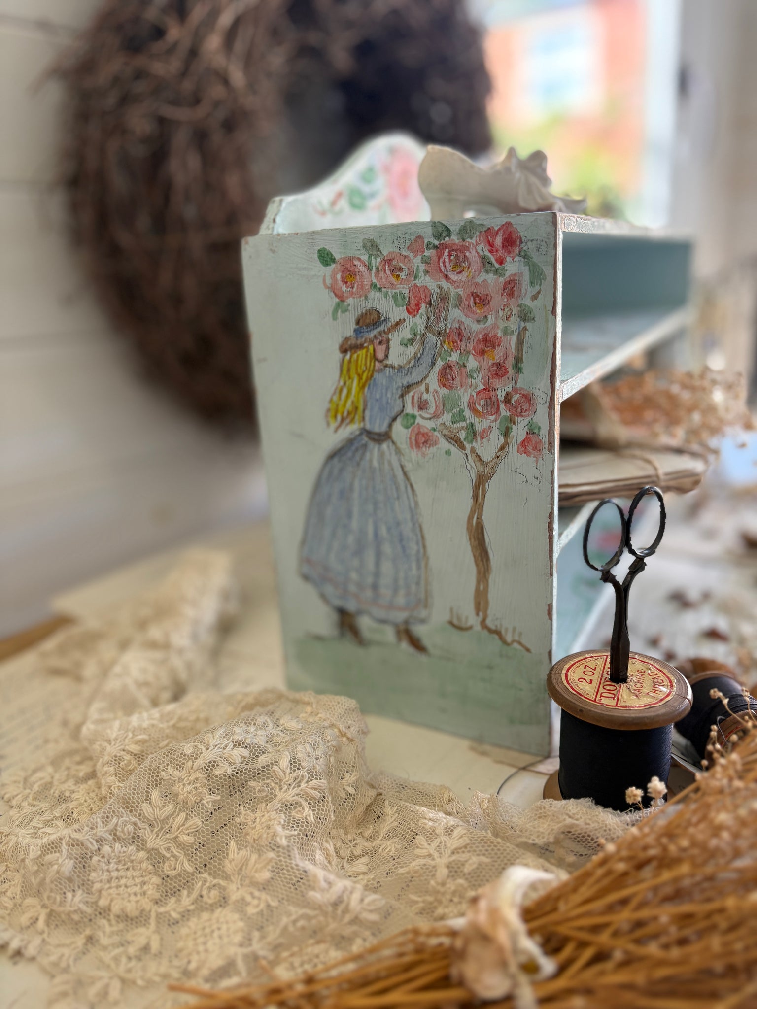 Hand-Painted Turquoise Wooden Shelf with Floral & Lady Design – Shabby Chic Style