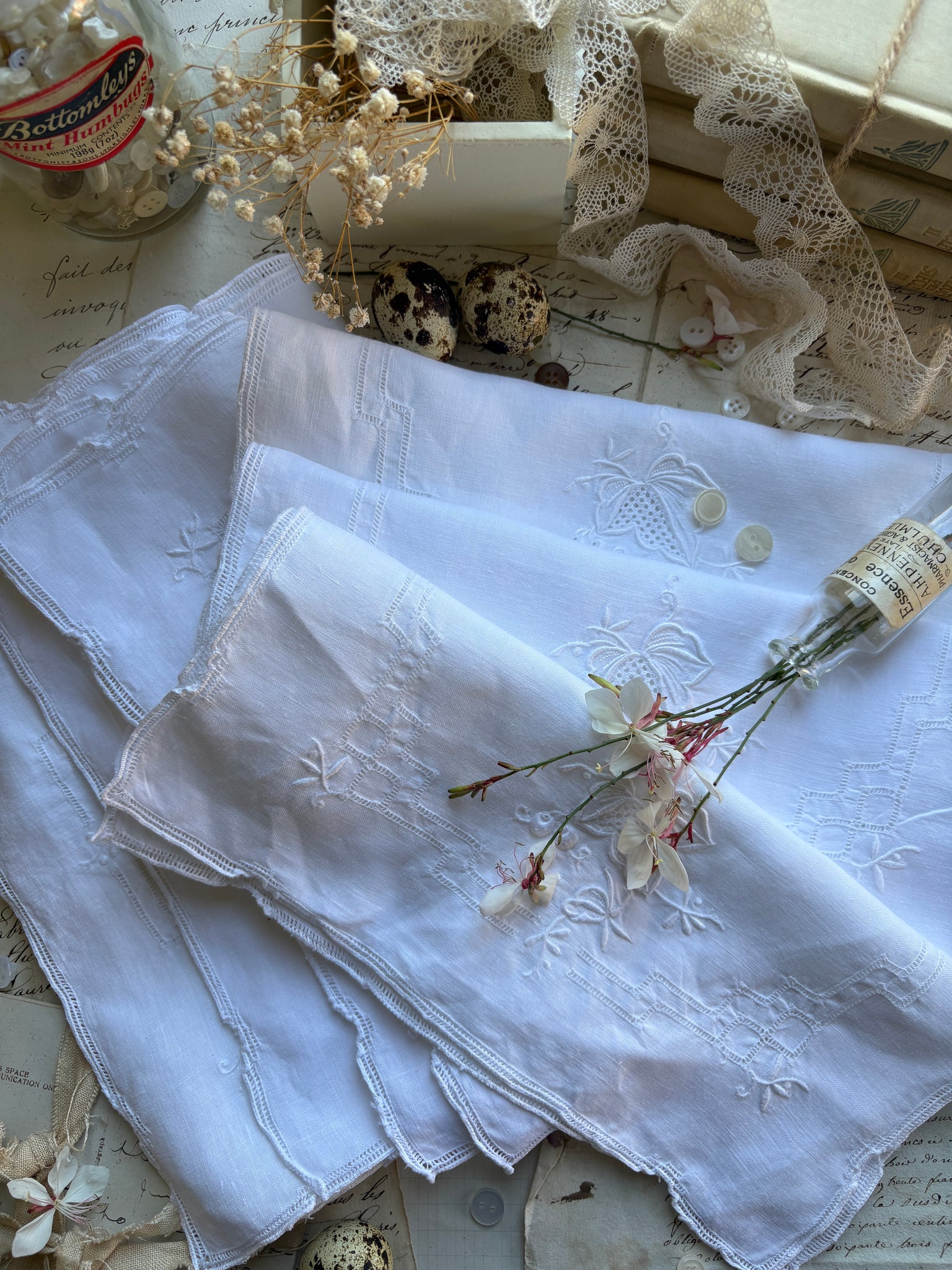 Brimming with quiet elegance and classic charm, this set of eight vintage oblong napkins beautifully blends practicality with timeless design. Crafted from a soft linen-cotton mix, each napkin features delicate leaf motif embroidery and a fine open boxed edge—a subtle yet striking detail that gives these pieces a refined, heirloom-quality finish.