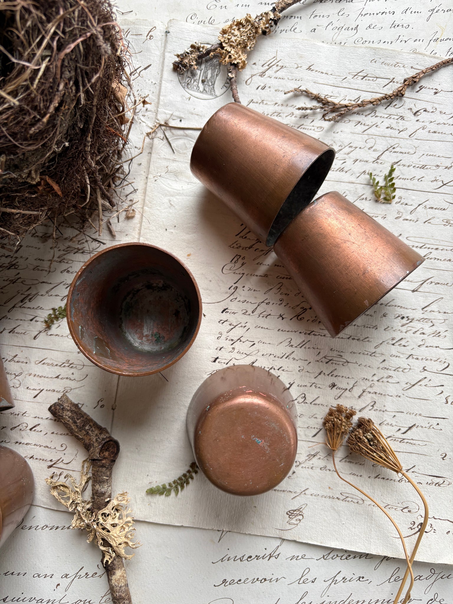 Crafted from solid copper and finished with a protective zinc lining, these cups were designed to hold water or spirits safely while withstanding frequent use. Over time, the copper has developed a rich, aged patina, giving each cup a warm, time-worn surface that speaks to years of handling and use.