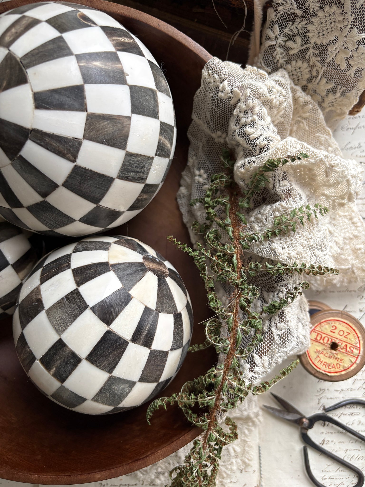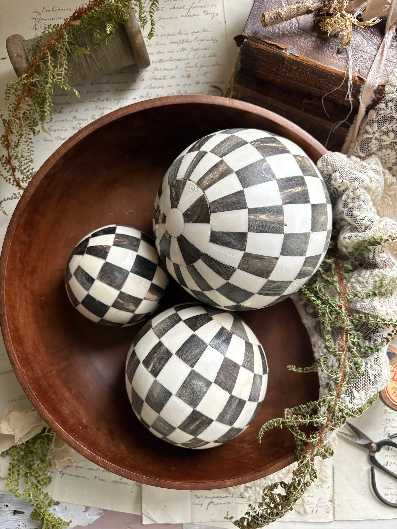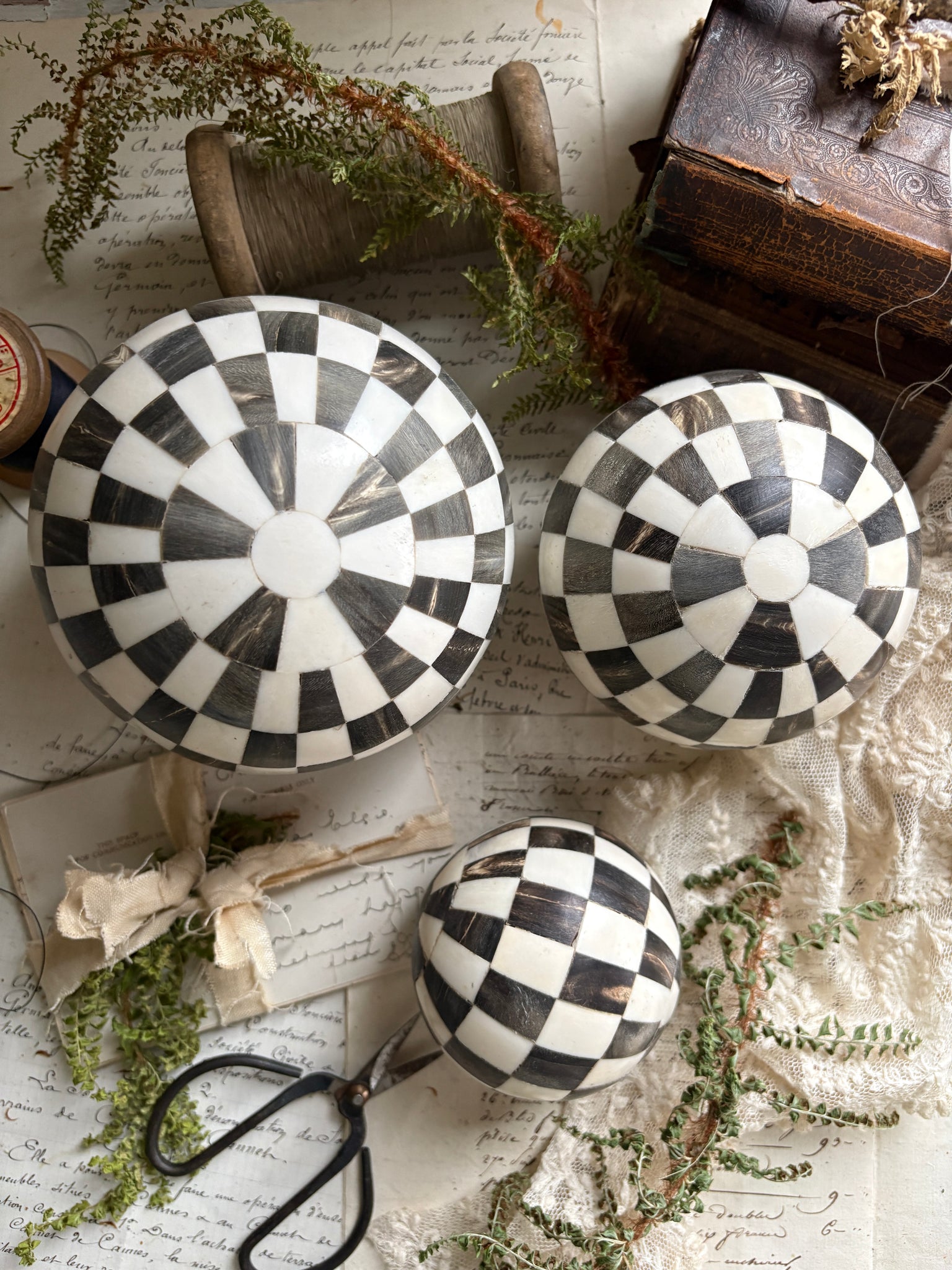 Each ball features a classic chequerboard pattern, carefully inlaid in alternating tones of black and cream, creating a captivating contrast that feels both nostalgic and modern. Their hand-finished look gives them that subtle, timeworn character we love — perfectly imperfect with gentle variations that make each piece unique.