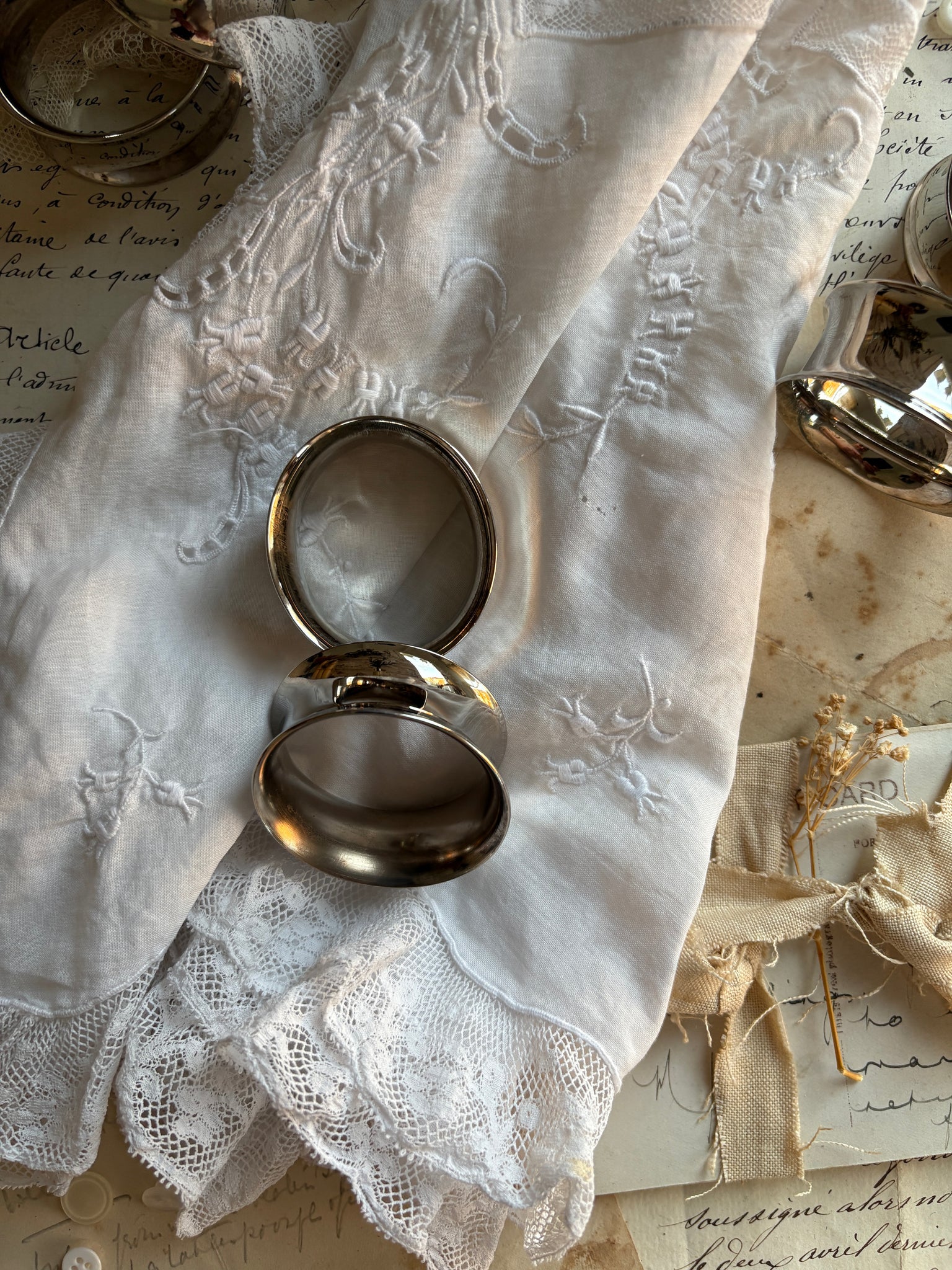 This exquisite set of six silver-plated napkin rings boasts a timeless oval shape and a luxurious polished finish that reflects light beautifully, adding an elegant shimmer to your table setting. Each ring is crafted with smooth edges and a robust build, ensuring both style and durability. The versatile design complements a variety of tableware styles, making these napkin rings ideal for formal gatherings, festive celebrations, or sophisticated everyday dining. Their polished surface provides an understated yet refined charm, perfect for elevating your dining experience.