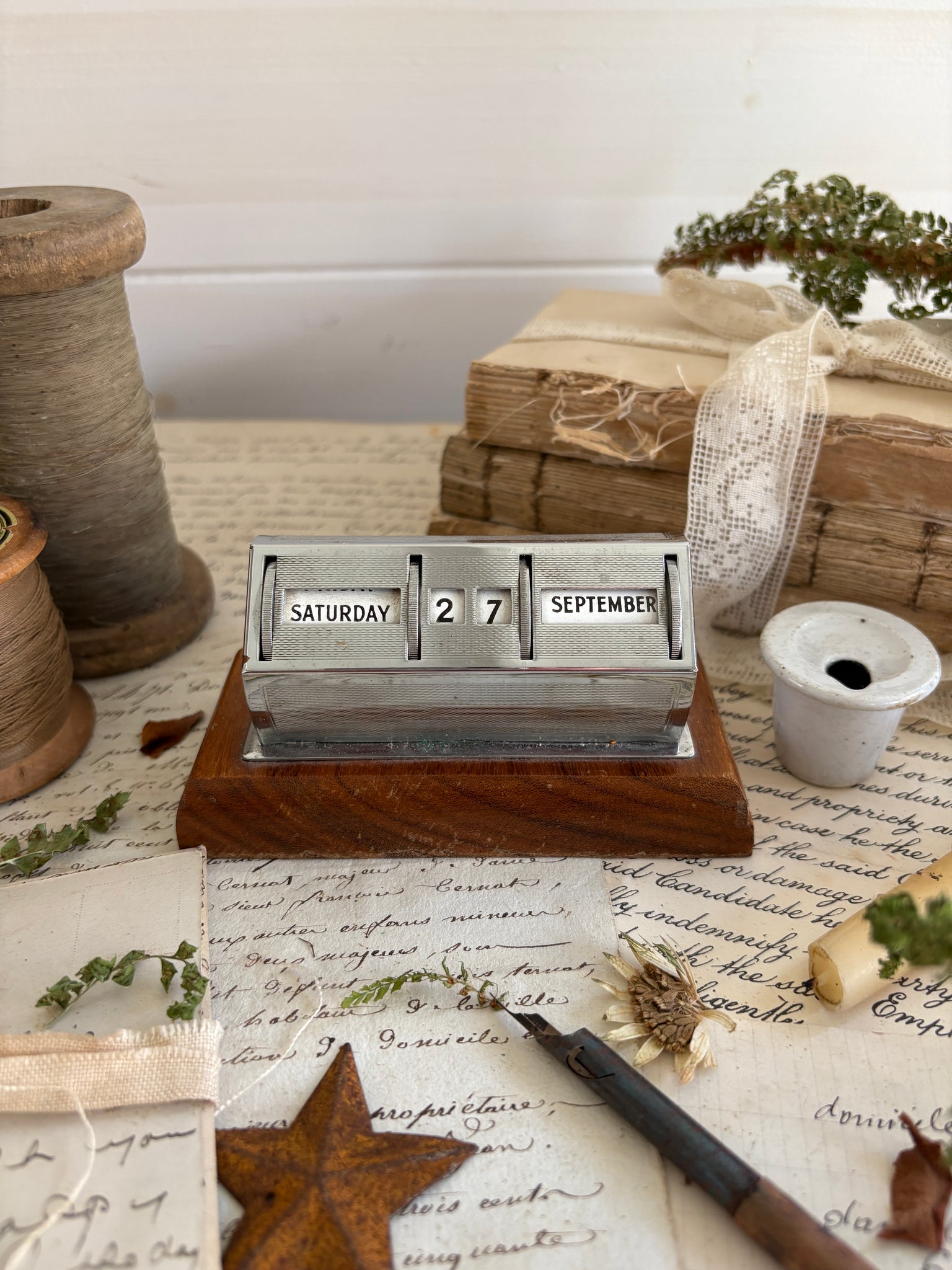 Keep track of the days in timeless style with this vintage perpetual desk calendar, a charming piece designed to be used year after year. With its manual rotating dials to change the day, date, and month, it’s a wonderful reminder of a slower, more deliberate way of keeping time — long before digital screens took over our desks.