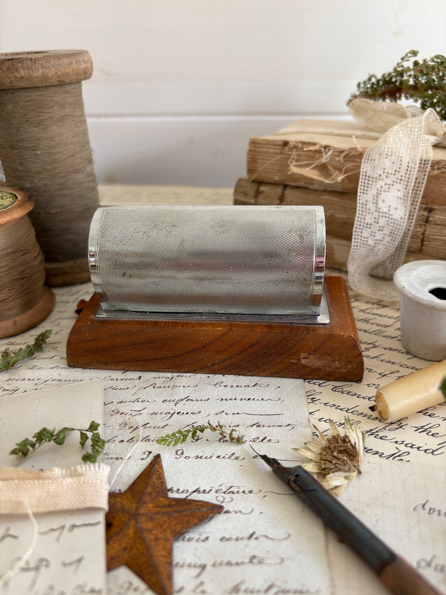 Set on a polished wooden base, this calendar combines practicality with classic design. The curved form and clean lines give it an unmistakable Art Deco aesthetic, perfect for adding a touch of early-20th-century elegance to your workspace, writing bureau, or home office.