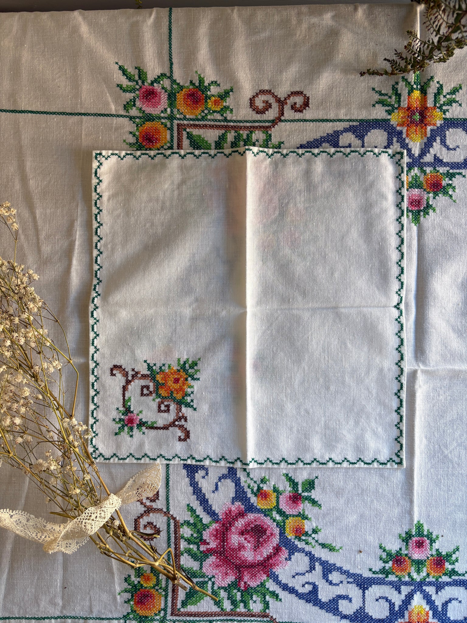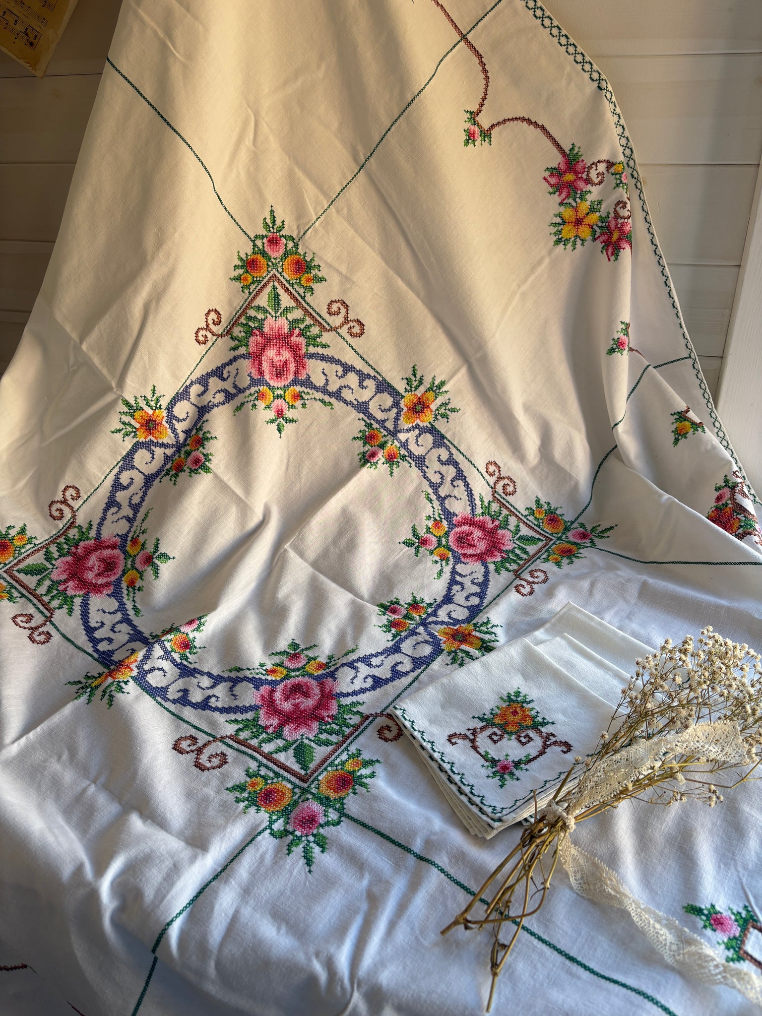 Vintage Square Embroidered Tablecloth with Six Matching Napkins