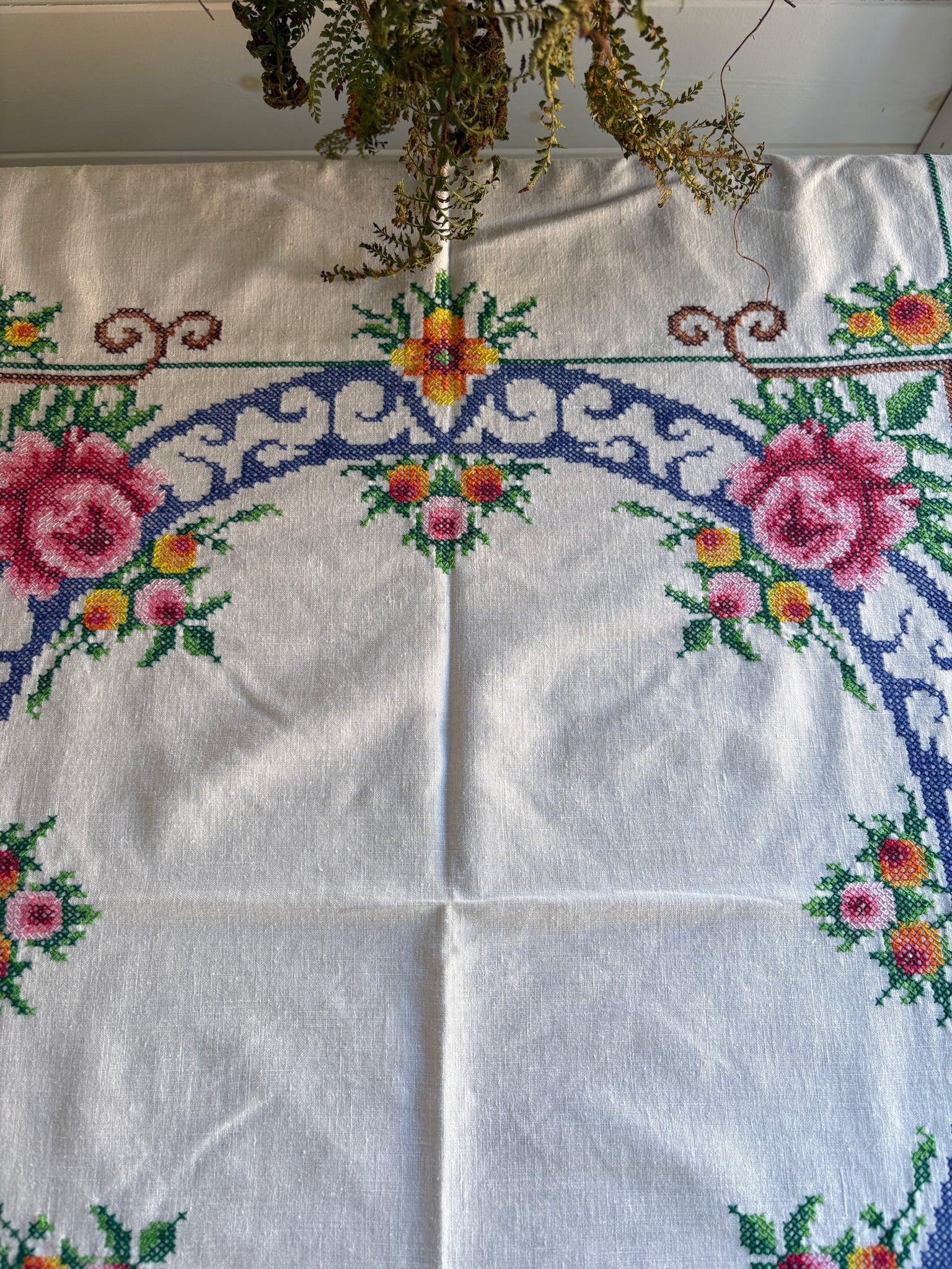 Thoughtfully hand-embroidered in the mid-20th century, this tablecloth would once have been brought out for special occasions — Sunday lunches, afternoon teas, and celebratory meals. The delicate stitching tells the story of careful craftsmanship, created at a time when table linen was treasured and often passed down through generations. Each motif has been meticulously worked, adding a gentle flourish that elevates even the simplest table setting.